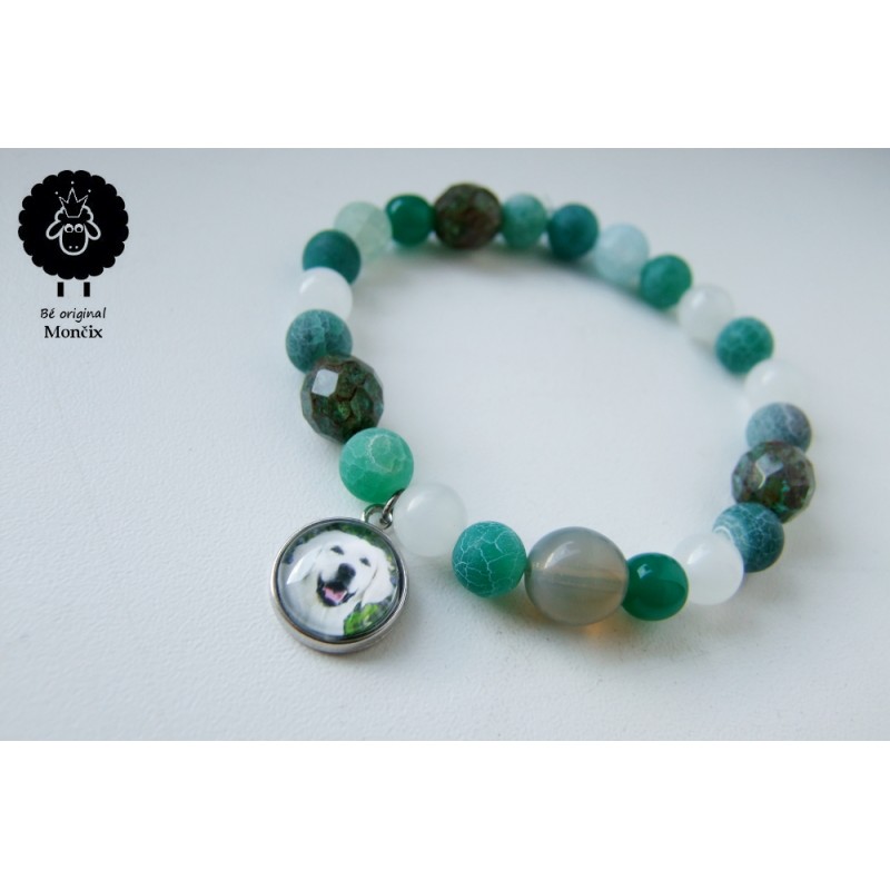 Přidáním této položky do košíku objednáváte zelený náramek s přívěskem s Vaší fotografií. (Na třetí fotografii jen ilustrační příklad přidání více fotografií na náramek)