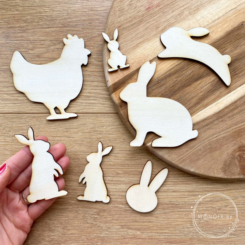 Vyřezané z topolové překližky. Výška slepice 10cm, nejmenší zajíc 5 cm, největší králík 10cm.
