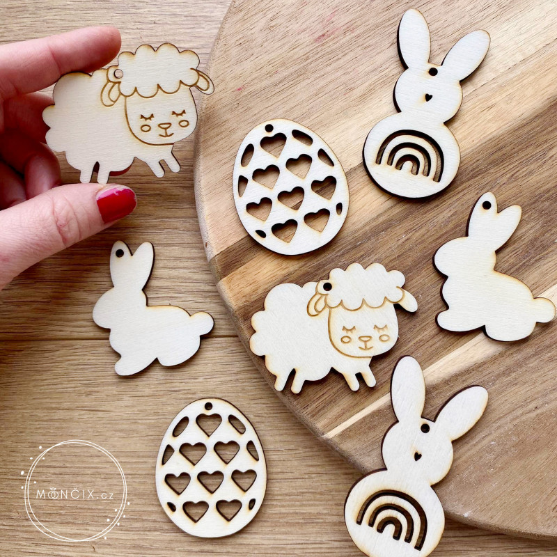 Vyřezané z topolové překližky. Výška vajíčka 5cm, výška ptáčka 9cm, výška vajíčka s ptáčkem 7cm.