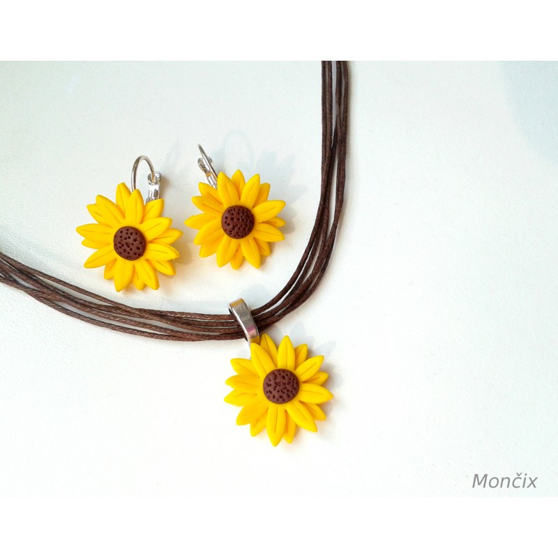 Výrazné slunečnice - květinky s hnědým středem na háčkách + náhrdelník.