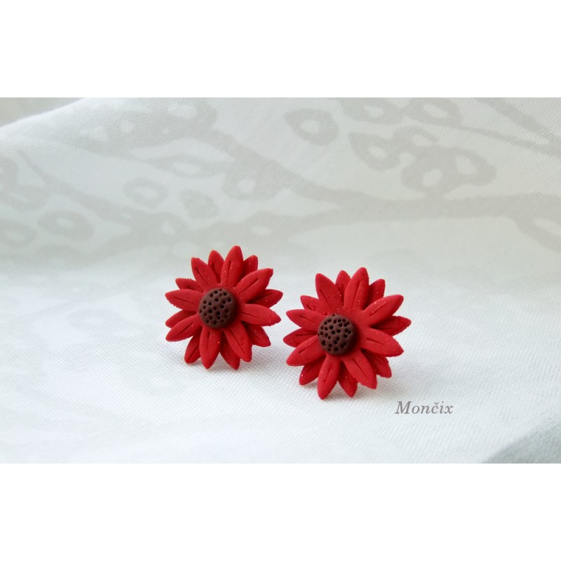 Květinky rudé třpytivě červené barvy s hnědým středem. Barvy podzimní a vánoční. Modelované z fimo hmoty v podobě náušnic.