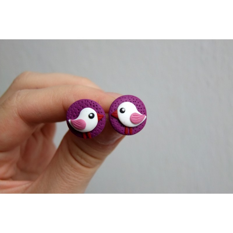 FIMO náušnice ptáčci ve fialové barvě.