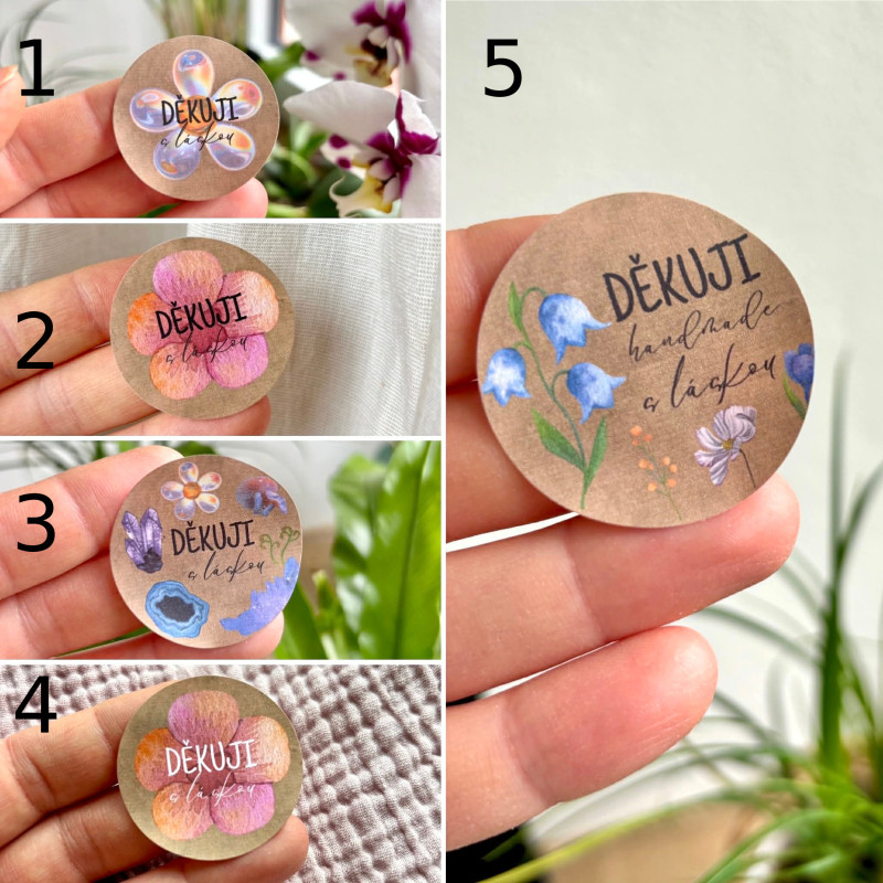 Jarní craft české samolepky Děkuji – ideální na balíčky, produkty nebo jako stylový branding. Jemné květinové a boho motivy. O průměru 4 cm!