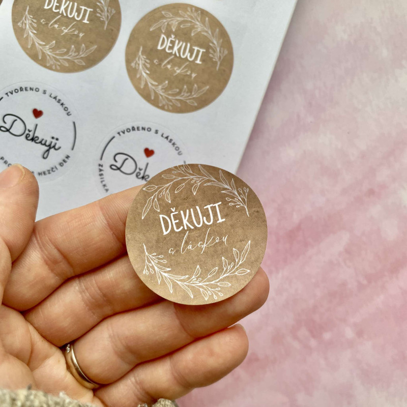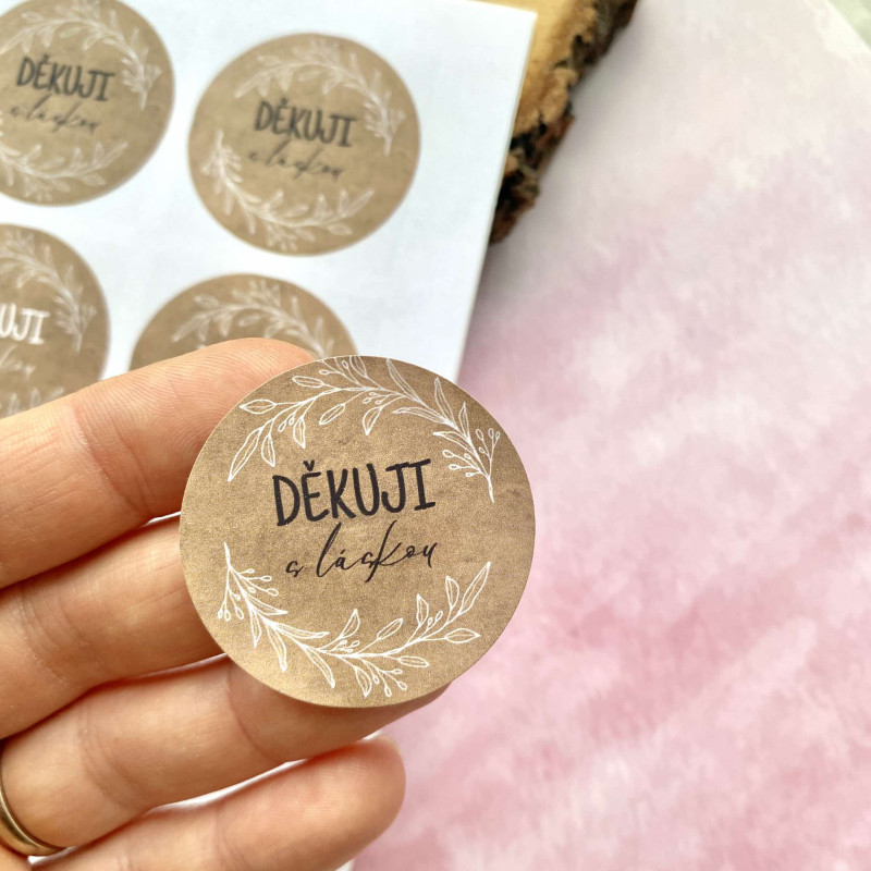 Rustikální craft české samolepky Děkuji s láskou s větvičkami – ideální na balíčky, produkty nebo jako stylový branding. O průměru 4 cm!
