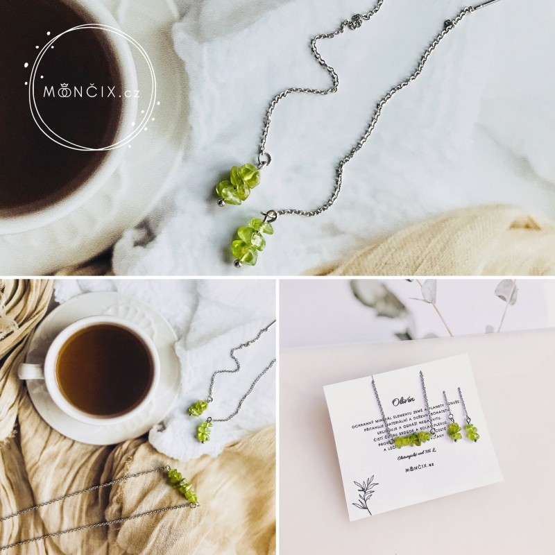 Jemný komplet náušnic a náhrdelníku s minerálem olivínem.