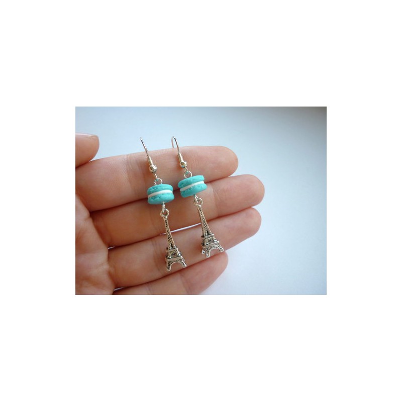 Náušnice v podobě Eiffelových věží a makaronek v modré barvičce.