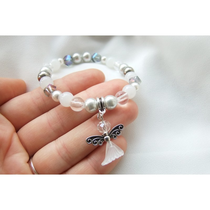 Náramek ručně vyrobený s korálky a nefritem, s andělkou.