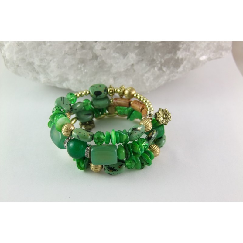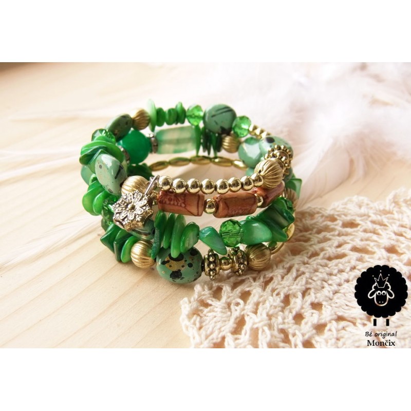 Náramek ručně navléknutý korálky, minerály, s přívěsky. Navléknutý na obruči - navléká se obtočením kolem ruky.