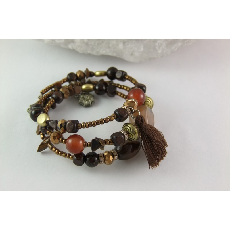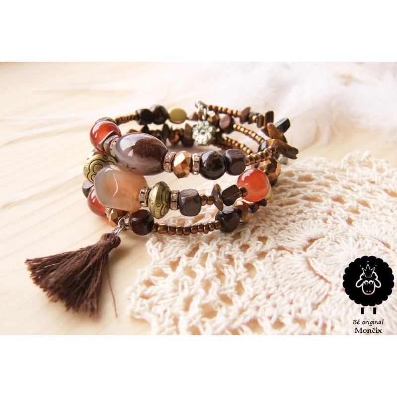 Náramek ručně navléknutý korálky, minerály, s přívěsky. Navléknutý na obruči - navléká se obtočením kolem ruky.