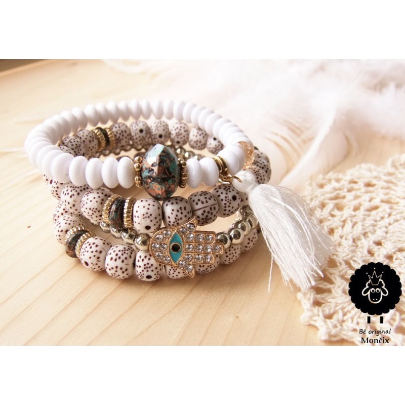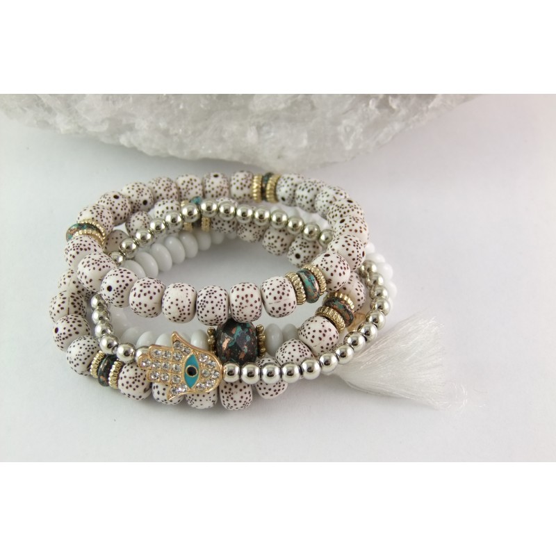 Náramek ze tří náramků oddělených, navléknutý korálky, semínky, s přívěsky.