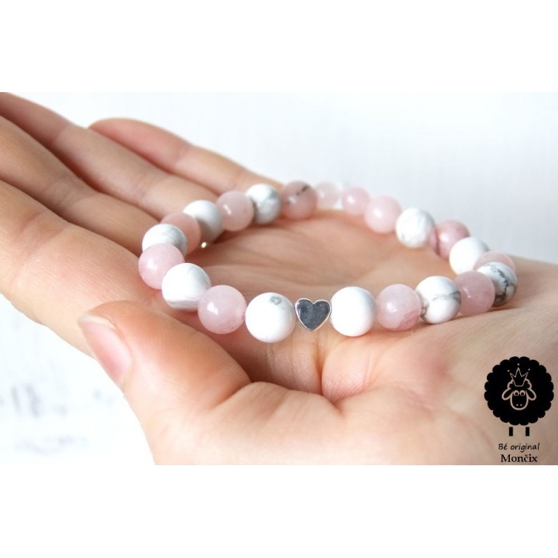 Náramek ručně navléknutý minerály na pružném silonu se srdcem.