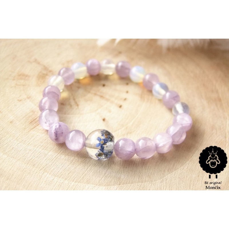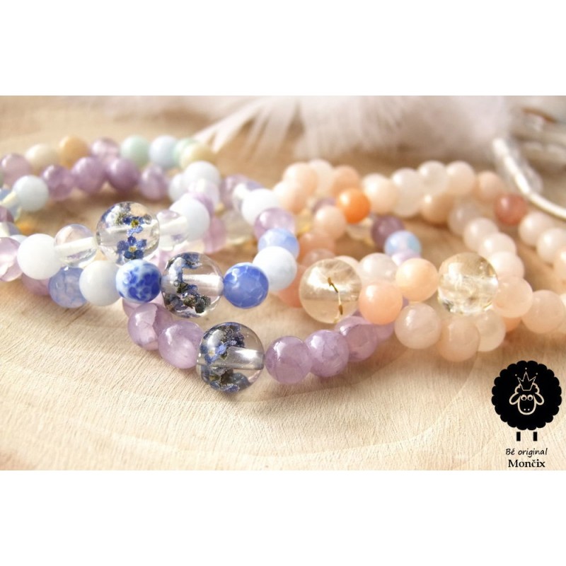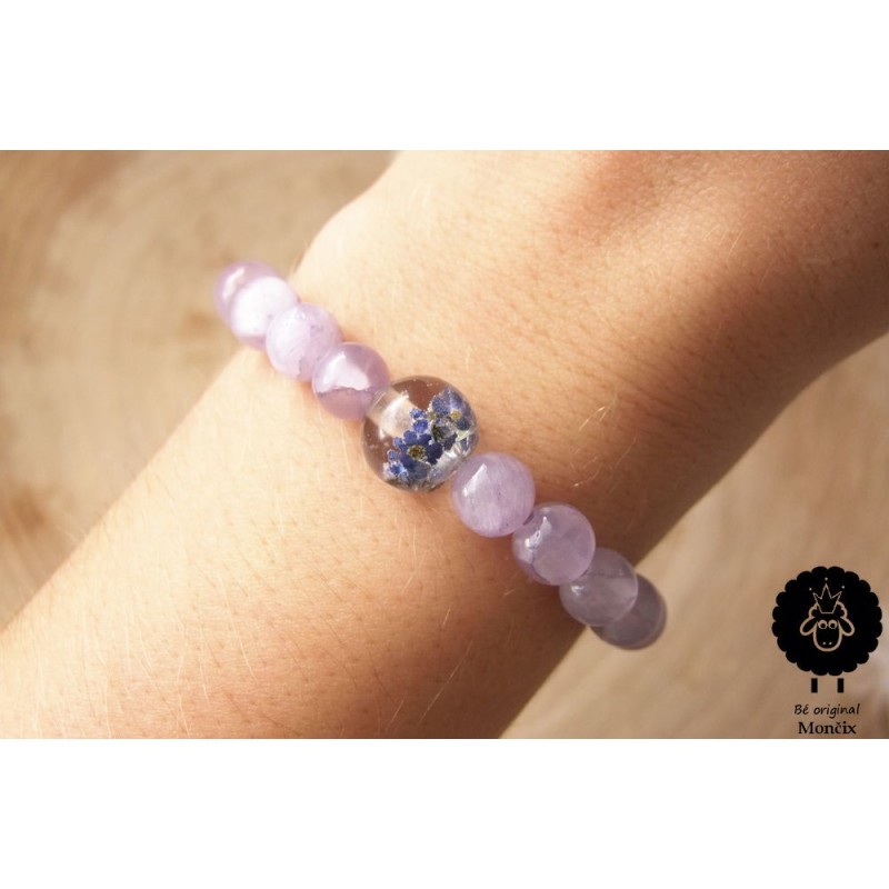 Náramek ručně navléknutý minerálem kalcitem a achátem, doplněn o ručně vyrobený korálek s živými pomněnkami v pryskyřici.