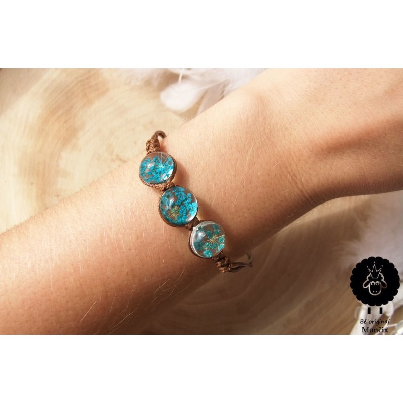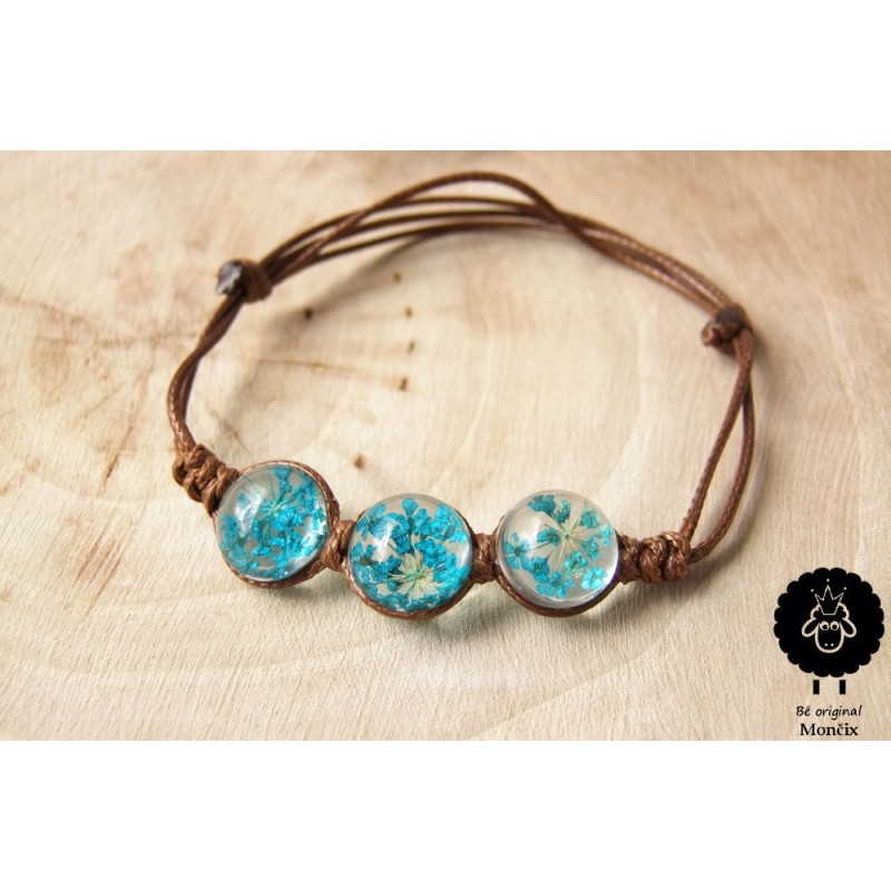 Náramek ručně navléknutý korálky s živými květy v pryskyřici.