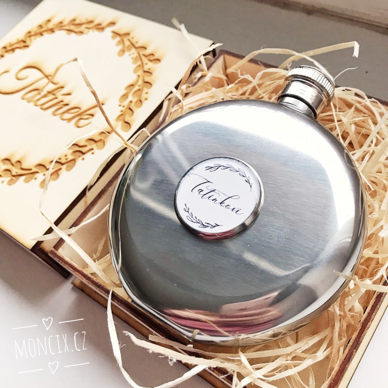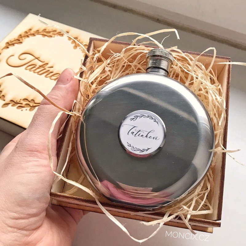 Doporučujeme k placatce zakoupit dřevěnou dárkovou krabičku s vypáleným vlastním věnováním. Placatka tak získá ještě luxusnější vzhled, v kombinaci s dřevem a slámou.