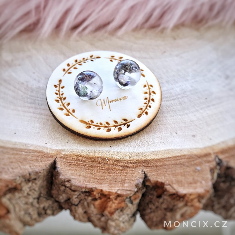 Jemné fialové náušničky pro vílu na dřevěné dárkové kartičce.
