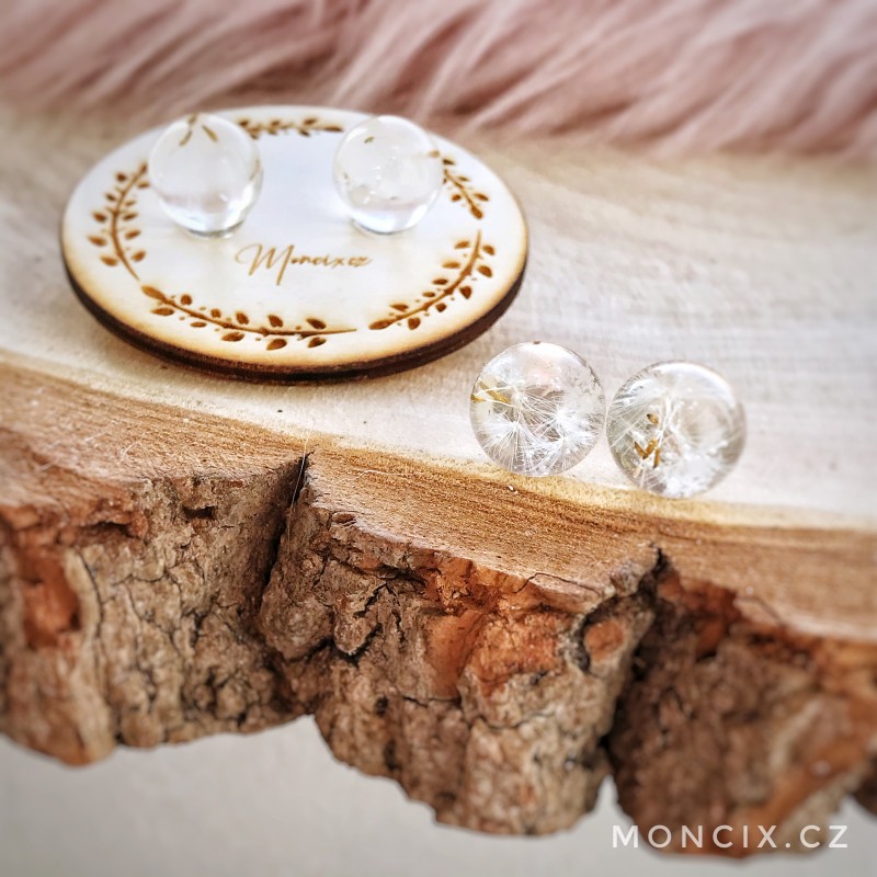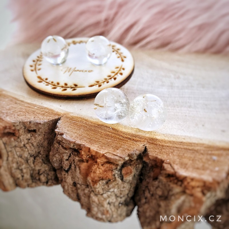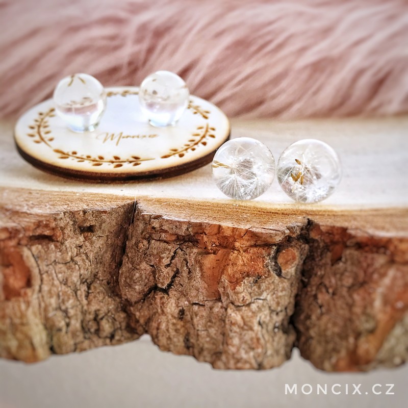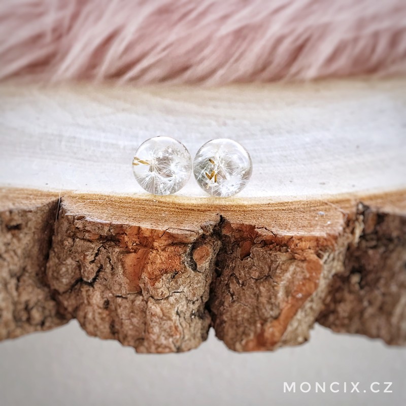 Pampeliškové náušnice. Jemné chmýří, semínka v pryskyřici.